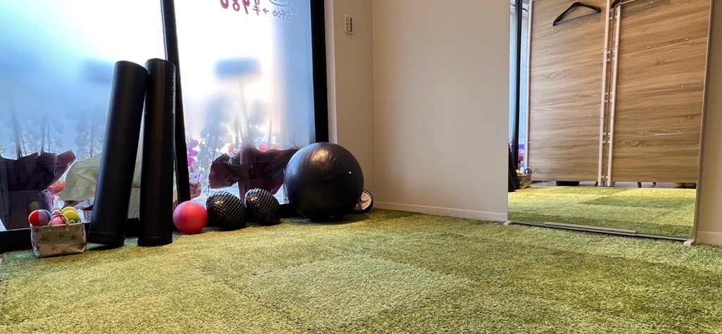 当院の一番の特徴であるトレーニングルームです。 痛める前より良い身体作り、患者様の理想のお身体に向けて一緒に運動を行なっております。
